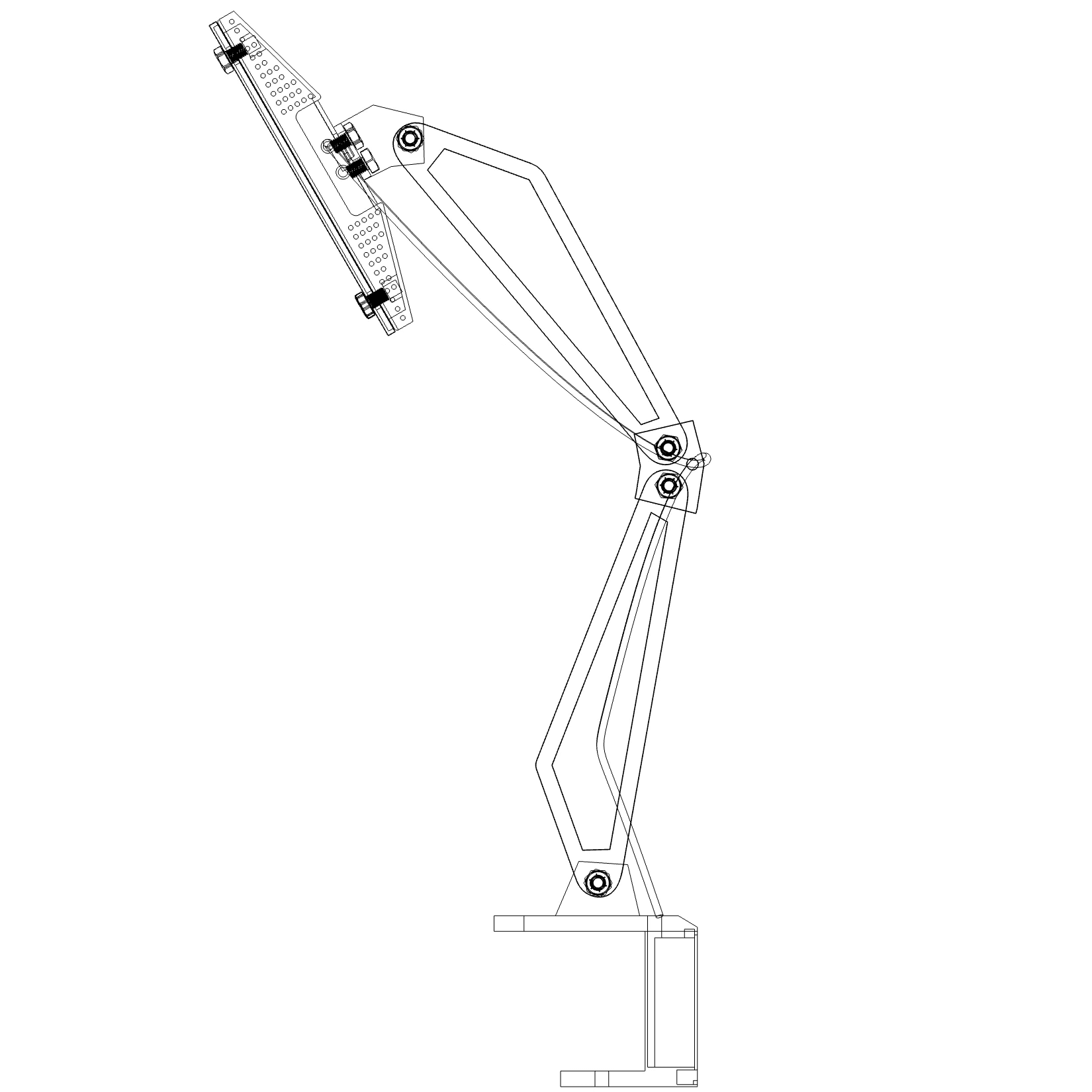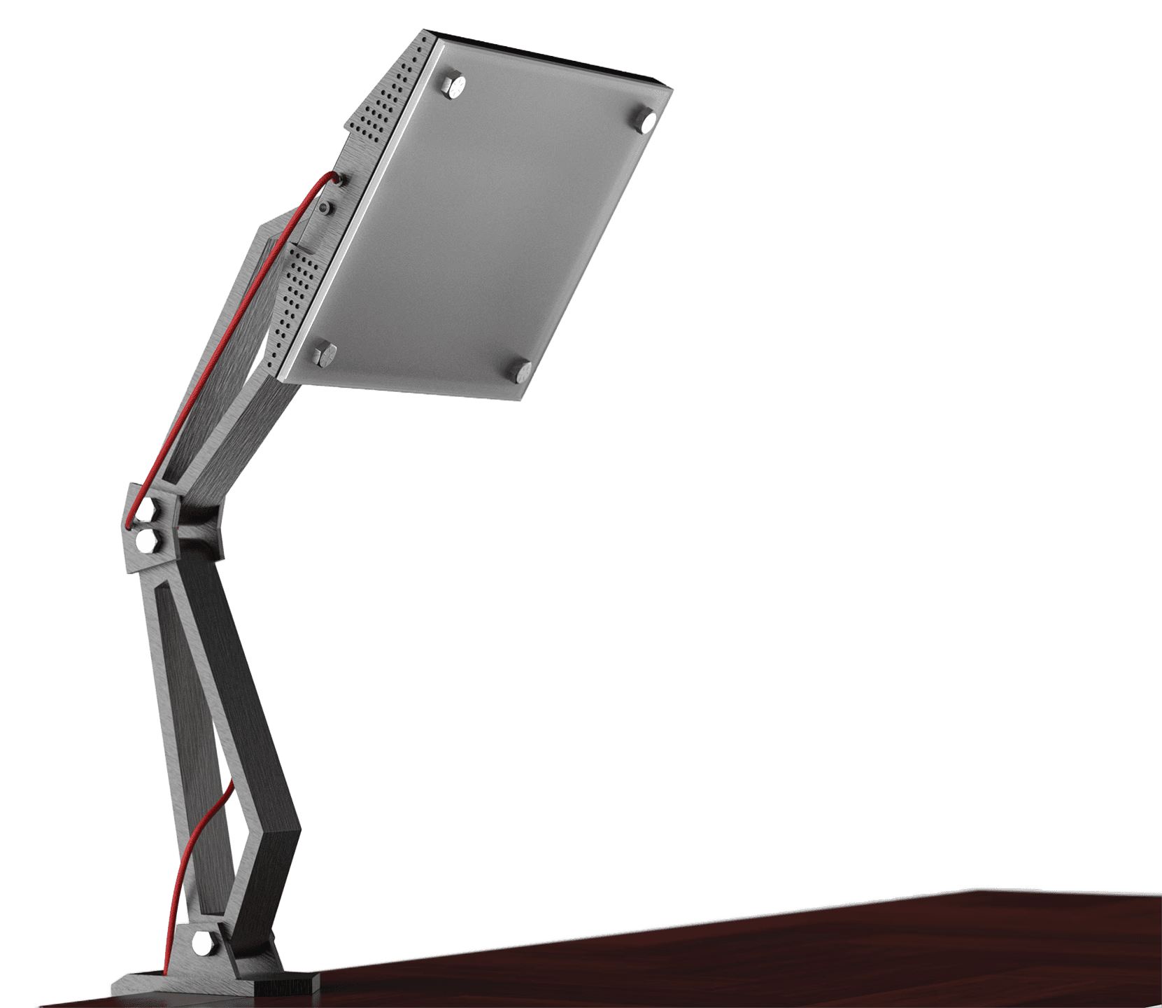 A battery operated desktop mounted utility lamp designed for creatives that require adaptability. It features an entirely articulated body, which allows adjustability for shifting needs. Exposed wires and hardware are presented intentionally, as inspiration stems from “cyber” aesthetics. A strong asset for those needing an addition to their workstation.